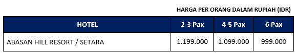 - Akomodasi penginapan 1 malam di Hotel Abasan Hills Resort/setara.